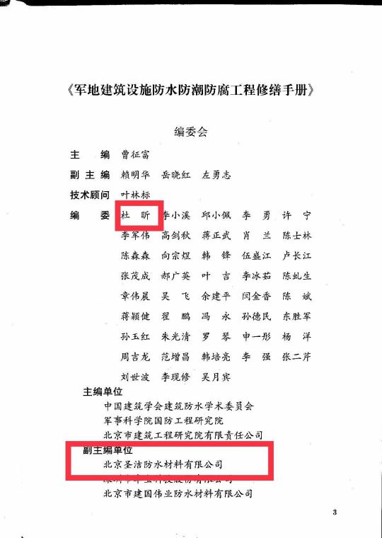 近日,由中國建筑學會建筑防水學術委員會、軍事科學院國防工程研究院、北京市建筑工程研究院有限責任公司主編,北京圣潔防水材料有限公司為副主編單位的《軍地建筑設施防水防潮防腐工程修繕手冊》已經正式出版發行。
