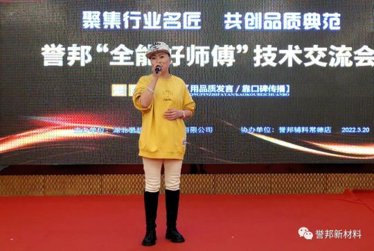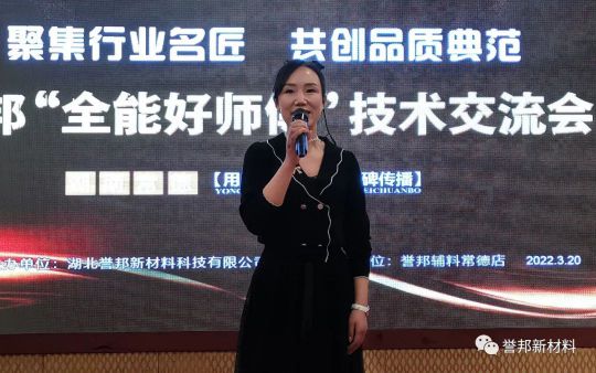 此次技術(shù)交流會特邀孝感譽邦負責(zé)人李倩擔任主持,下午17:50會議在主持人激情澎湃的開場白與美好祝福中拉開序幕。接著常德譽邦店負責(zé)人覃姐對到場的工匠師傅、合作伙伴們表示熱烈歡迎,對大家長期以來的支持表示誠摯感謝。希望通過本次交流會讓與會師傅們對譽邦有更深的了解,增加對譽邦優(yōu)質(zhì)產(chǎn)品的信心,聚力于為大家提供高價值的產(chǎn)品和精益化服務(wù)。