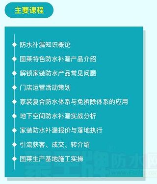 為提升固萊合作伙伴們的營銷能力、服務(wù)素養(yǎng)和防水補(bǔ)漏技能,固萊集團(tuán)將于6月27日—6月30日,在集團(tuán)總部舉行為期3天半的防水補(bǔ)漏培訓(xùn)班。不論您是防水補(bǔ)漏行業(yè)零基礎(chǔ)小白,還是想自主創(chuàng)業(yè)的創(chuàng)業(yè)者,或是想要提升業(yè)務(wù)能力的代理商,只要您來就能收獲防水補(bǔ)漏知識,市場營銷知識,建筑基礎(chǔ)知識等專業(yè)課程,實(shí)現(xiàn)防水補(bǔ)漏知識和經(jīng)驗(yàn)的最大增值。
