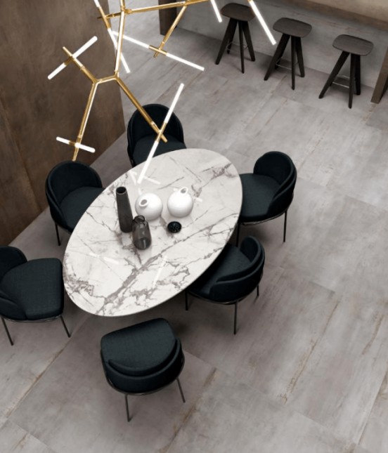 ICC WIDE巖板共有7個(gè)系列,涵蓋了 水泥、大理石、金屬、巖石等類型的多種款式,不僅有是亮面的,還有半拋、啞面或者帶模具效果的。