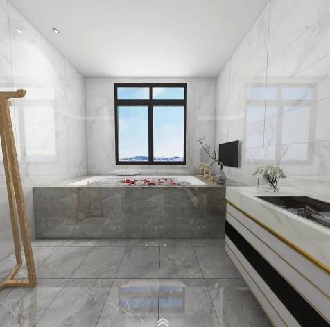 “爵士白”亮光磚面在自然光的照射下,讓衛生間更顯明亮寬敞;墻地經典的深淺色調搭配,讓人百看不厭;“灰色森林”花磚裝飾墻面一角,釋放盛夏自然氣息;金屬線條+大理石材組合,高級感滿滿。