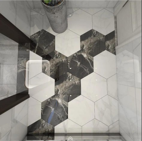 二層衛生間采取了干濕分區的布局,墻磚選用“爵士白”一開三上墻鋪貼,純凈清爽的“爵士白”,質感非常強;300*800mm“卡薩布蘭卡”花磚點綴墻磚,把大自然的元素帶回家,享受這種自然舒適的感覺;地磚在鋪貼時,設計師加入了自己的一些小創意,把淺色系的“爵士白”和深色系的“黑布林”切割成六角磚,“黑布林”的小范圍點綴,個性又時尚。