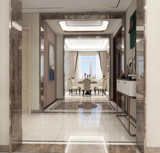 整個居室的公共區域地面統一選擇了伊莉莎白900*900mm規格的“維納斯”和“索瑪棕”組合搭配,把“維納斯”的浪漫情懷與“索瑪棕”的高貴典雅融入空間,打造極具格調的歐式輕奢范;搭配現代裝飾畫,古銅金屬線條點綴,提升空間檔次。