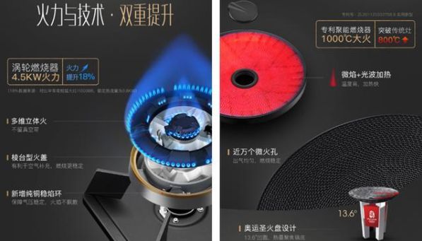 先不說不同爐頭的雙眼灶有什么好處,我們先來看下這兩個爐頭的優良燃燒性能。華帝鴛鴦灶左邊爐頭是渦輪燃燒器,產生環形立體火焰(屬于直火灶類型),這種爐頭火焰均勻,熱力穩定,大火猛烈,小火也不易飄散;右邊是華帝聚能灶,采取合金體的蜂窩燃燒器,近萬個微火口均衡輸出紅色烈焰,加上奧運圣火盤的凹型聚能光波,火力劇烈,加熱速度更快。