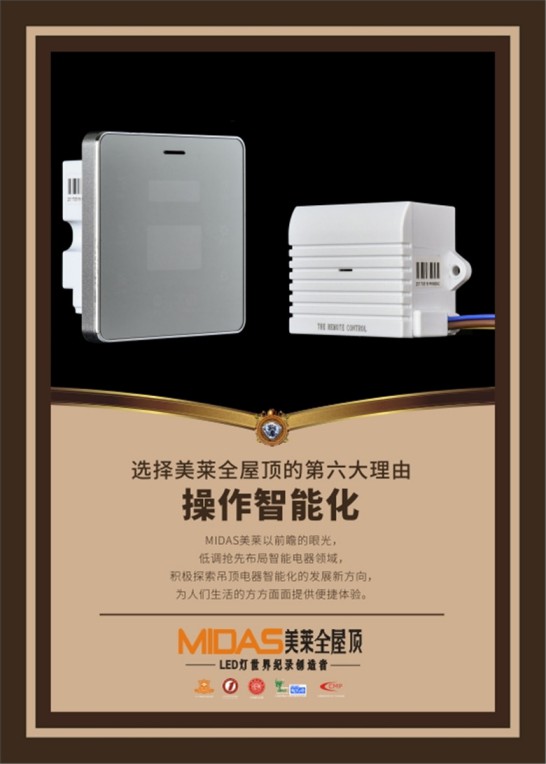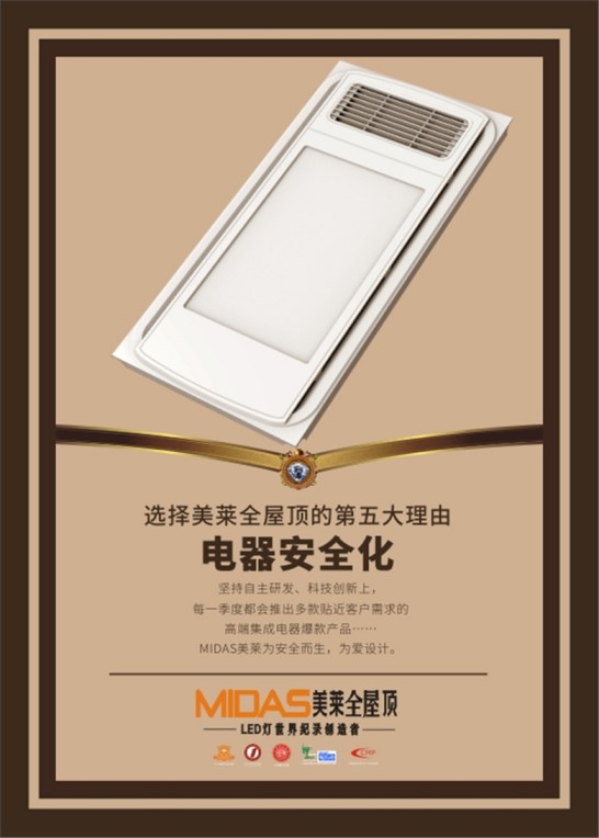 MIDAS美萊全屋頂,不僅在扣板方面匠心專注,在集成電器領域亦是潛心研究,努力為消費者們解決一個又一個難題,為其創造一個安全舒適的居家環境。在堅持自主研發、科技創新上,不敢有絲毫懈怠,每一季度都會推出多款貼近客戶需求的高端集成電器爆款產品。如特種微晶輻射防爆玻璃、耐溫達到800度的美萊碳纖維取暖電器,秒速升溫,安全放心;美萊新一代浴室抗寒神器“雙區空調(六合一),采用高端納米陶瓷PTC取暖,升溫迅速,干濕區同時送暖,智能溫控多重安全保護,一臺電器頂2臺;美萊LED世界紀錄燈,節能防水“高壽”,真正做到10年不換燈……MIDAS美萊為安全而生,為愛設計。