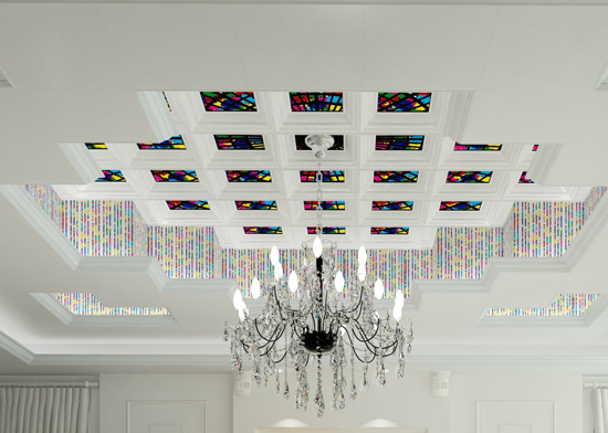 當然展廳內最引人注目的還是品格的米蘭陽光頂和藝術星空頂,一批又一批的觀眾駐足欣賞。米蘭陽光頂保留了米蘭大教堂圓的特色,將“疊彩文字”與窗戶繪畫結合,色彩繽紛絢麗;格柵、畫框以及立面的組合,形成三個鮮明的層次,賦予客廳高闊的空間感。藝術星空頂的靈感來源于浩瀚星空,白色邊框搭配定制的12星座星空圖案,讓整個臥室如同一片璀璨的星空,浪漫而唯美。