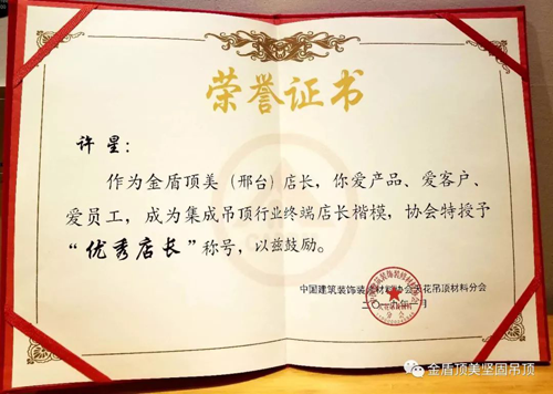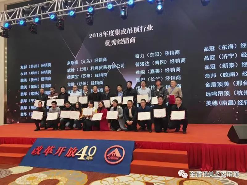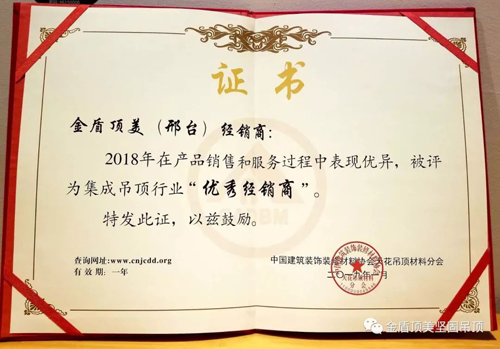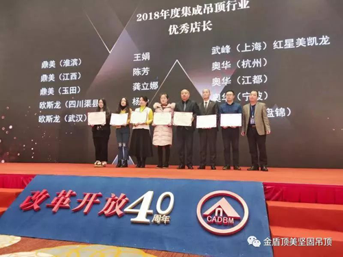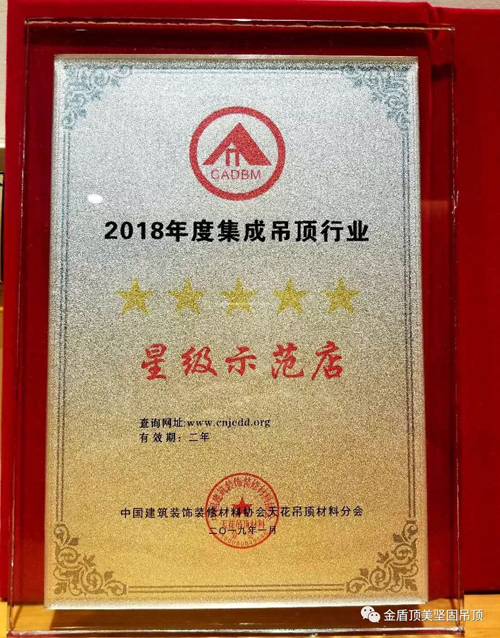 金盾頂美邢臺店榮獲【2018年度集成吊頂行業優秀經銷商】稱號,并同時授予五星門店稱號
