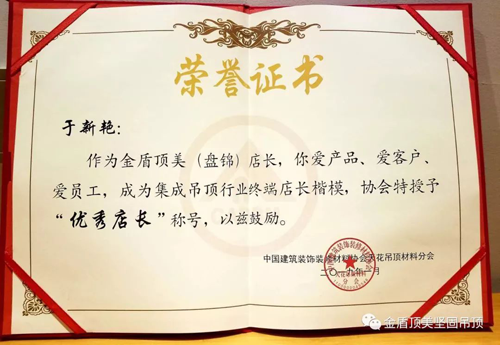 金盾頂美盤錦店于總榮獲行業【優秀店長】稱號