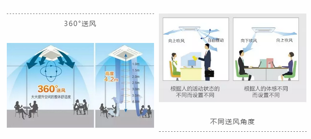 日立新一代嵌入式室內機,四面出風的功能,為辦公室、會議室和會客室等公共區域創造舒適的體感環境。它的360°環繞送風、四檔風量、四面擺葉,各種人性化細節設計,可實現送風角度獨立調節,根據人的體感進行不同送風角度設置,舒適性良好;