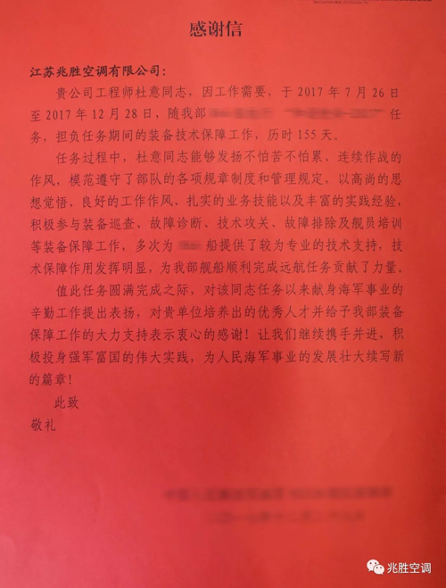 任務執行期間,兆勝安排專業工程師隨船全程執行了保障任務,對設備進行了日常巡檢、維護保養,并組織艦員開展了技術培訓等保障工作,確保了任務期間整船空調、冷藏設備無故障可靠穩定運行,兆勝空調工作人員良好的工作作風、扎實的業務技能得到客戶的高度認可。