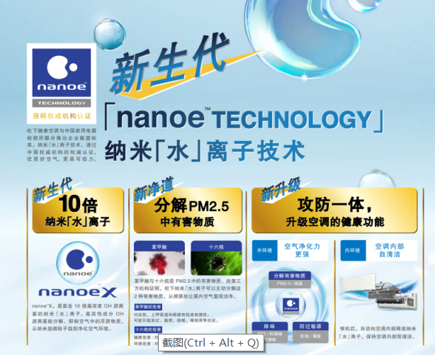 這臺空調(diào)采用松下新開發(fā)的納米電子技術(shù),納米離子(NanoeX)是一組富含10倍高濃度羥基的納米水離子,能夠分解PM2.5中的有害物質(zhì)苯甲酸和十六烷,并將其轉(zhuǎn)化為安心的水分子。它還能去除家庭香煙味、寵物味、烹飪味、花粉霉菌和其他威脅家庭健康的有害物質(zhì)。因此,配備納米科技(nanoeX)的AE系列健康空調(diào)相當(dāng)于一套空氣凈化器和空調(diào)的組合設(shè)備。