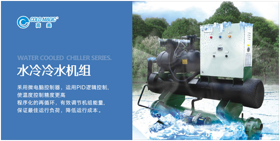 水冷式冷水機組,是利用殼管蒸發器使水與冷媒進行熱交換,冷媒系統在吸收水中的熱負荷,使水降溫產生冷水后,通過壓縮機的作用將熱量帶至殼管式冷凝器,由冷媒與水進行熱交換﹐讓水在吸收熱量后通過水管將熱量帶出外部。