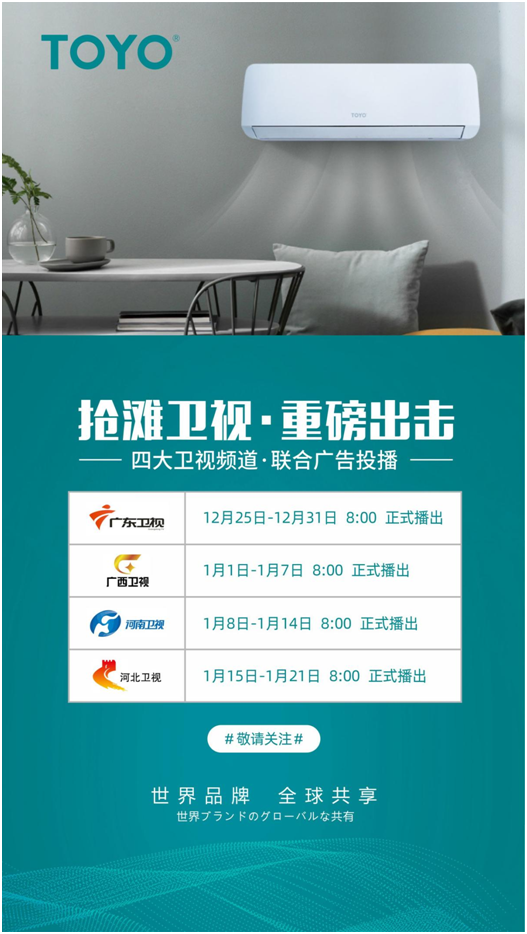 喜報!熱烈慶祝TOYO空調成功上榜廣東衛視、廣西衛視、河南衛視及河北衛視電視頻道!