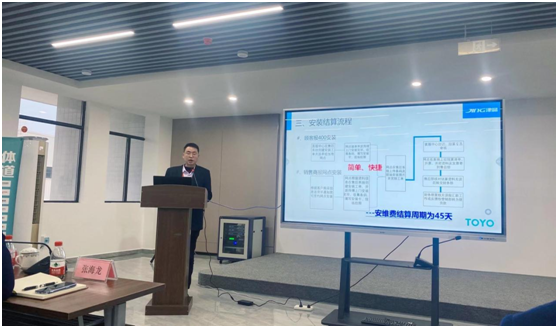 TOYO東洋空調售后部長黃昌華發表售后報告。他提出,集團建立完善的全國售后服務體系,包括服務登記系統、服務查詢系統、智能驗收查詢系統、服務保障系統,具有強大的時效性,旨為終端消費者提供終身質保的服務,堅定地維護消費者權益。