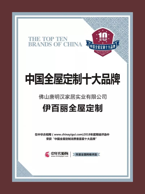 伊百麗全屋家居再次在由CNPP官網和十大品牌網主辦的活動中斬獲“全屋定制家具十大品牌”這項殊榮!