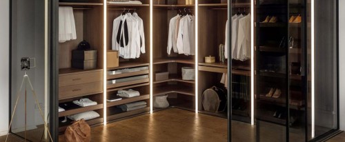 這個步入式衣帽間提供了絕佳的沉浸式體驗,衣柜和滑動門作為空間的外殼,與整個家庭融為一體,最大限度地延長了生活的舒適性。木質材料、隱藏的燈光和存儲空間的充分利用使衣帽間成為休息的空間。