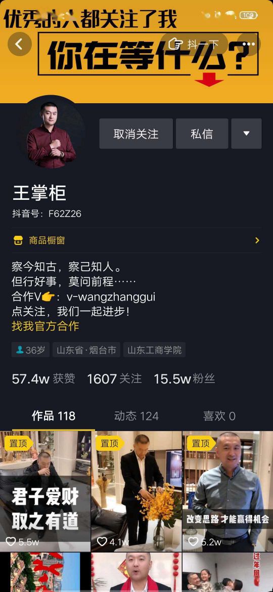 “王掌柜”,定位是抖音個(gè)人IP號(hào),迄今為止,已發(fā)布了118條作品,累積粉絲15.5w,點(diǎn)贊量最高的視頻達(dá)到5.5w,這對(duì)于一個(gè)沒有團(tuán)隊(duì)打造的王總來說,能取得這樣的成績(jī)確實(shí)亮眼。