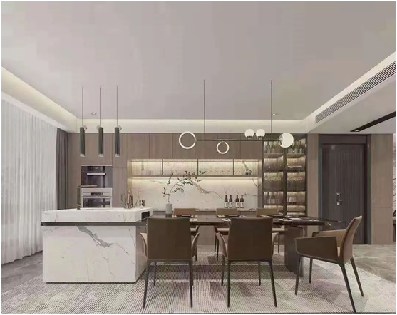中秋,少不了一頓聚餐,或邀請(qǐng)朋友,或身邊人團(tuán)圓。所以,除了客廳,餐廳也是親朋好友團(tuán)聚時(shí)的重要地點(diǎn)。通過餐廳的巧妙布置,也能讓人感受到滿滿的幸福感。簡·愛保羅推薦餐廳墻面的顏色最好選擇偏素點(diǎn),肌理不能太搶眼,不然會(huì)讓小朋友們光顧看墻面卻忘記進(jìn)食。圓形含有“團(tuán)圓”的意味,在餐廳中增加有關(guān)于圓的元素,不僅裝飾性強(qiáng)、有創(chuàng)意,還具有美好的寓意。能夠在簡潔的空間中起到畫龍點(diǎn)睛的作用,增加一絲活潑感,使整個(gè)空間多了一份生機(jī)和韻味。