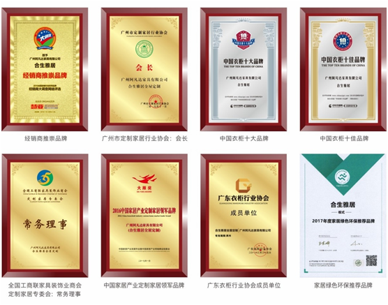 經過十余年發展,合生雅居已成為定制家居行業領先品牌,是廣東省綠色供應鏈協會執行會長單位,廣州市定制家居行業協會會長單位,廣東省四川南充商會常務副會長單位,中國家具協會常務理事單位,廣東衣柜行業協會成員單位。