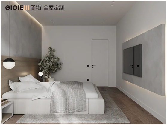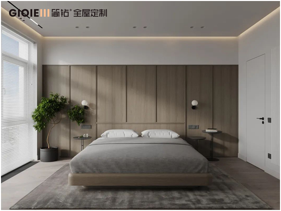 主臥,呈現保有簡潔與純粹的視感維度,木飾面與膚感板的組合,延伸出墻、柜與門的序列感,構造起溫馨的生活空間。