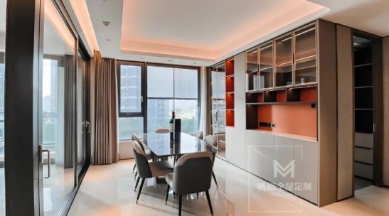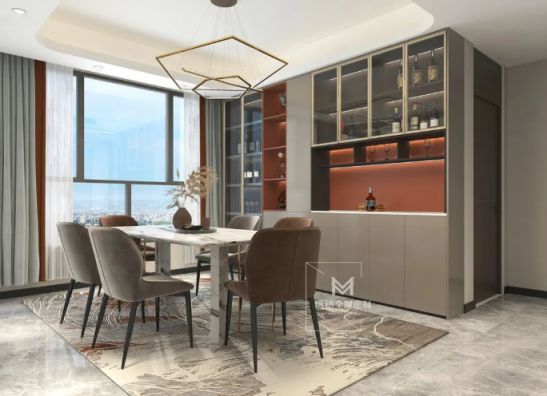 香檳色鋁框玻璃柜可藏可展,以海棠紅撞色為餐廳注入一抹時尚與溫馨,絨面靠椅與巖板餐桌一柔一剛的搭配,盡顯空間的克制之美。