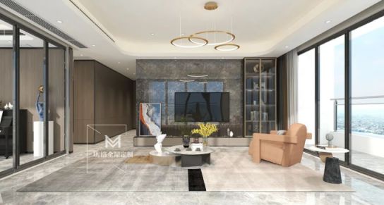 客廳雙面設置寬境落地窗,將窗外風景框成一幅隨四季而動的畫卷,電視背景墻引入自然巖板細膩紋理與光影相映成趣續寫時光的詩意。