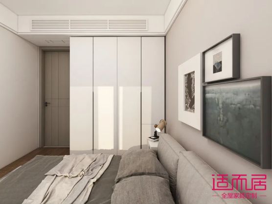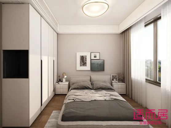 主人房已灰色調為主色調,迎合了房子主人對高級感的需求,莫蘭迪灰的衣柜+灰色的床+灰色乳膠漆的床背景墻,高級感滿滿。