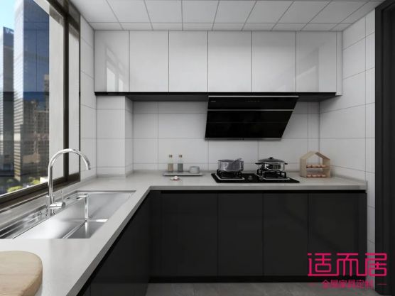 顏色搭配上,也是采用黑白搭配,吊柜用亮光白,提亮這個空間感,地柜采用亮光經典深灰,耐臟且高級。