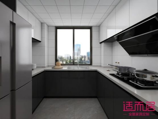 廚房空間比較方正,采用U型的櫥柜設計師最佳選擇,左邊放電飯煲和冰箱,靠窗設計水盆,右邊設計炒菜區域,動線非常合理且實用。