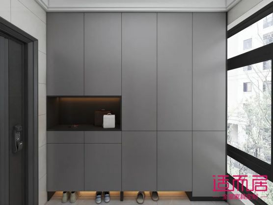 入戶鞋柜整體設計以簡潔為主,無拉手設計,搭配莫蘭迪灰的柜門,高級感即顯,入門做部分開放格,可以順手放東西,底部鏤空放常用鞋,開放區域加上燈帶,簡單又高級。