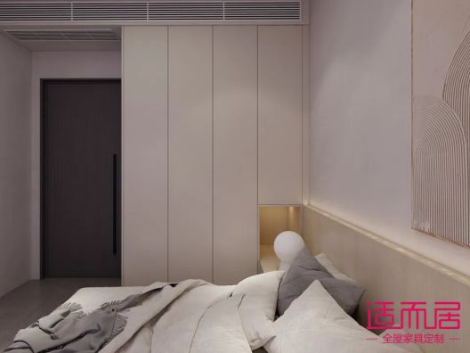 床頭采用柜墻門一體的設計,背景墻設計與房間門融為一體,頂面無主燈設計,整體都透露著設計感,科技感~