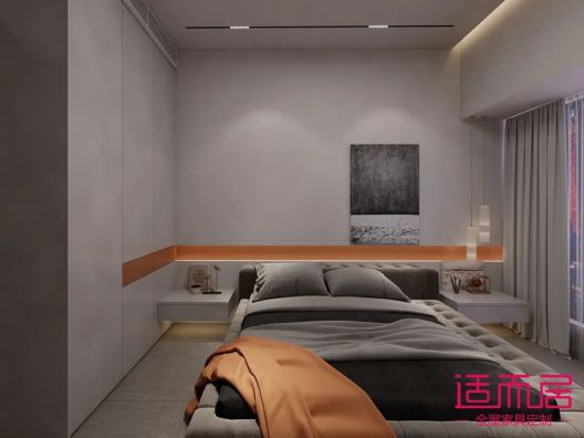 男孩房,也是用新品凱曼石紋,有一種侘寂風的感覺,橙色元素點綴,灰色調,簡約素雅。床頭與柜體一起設計,更加整體。
