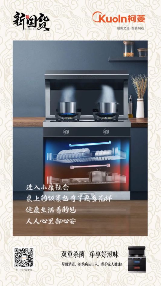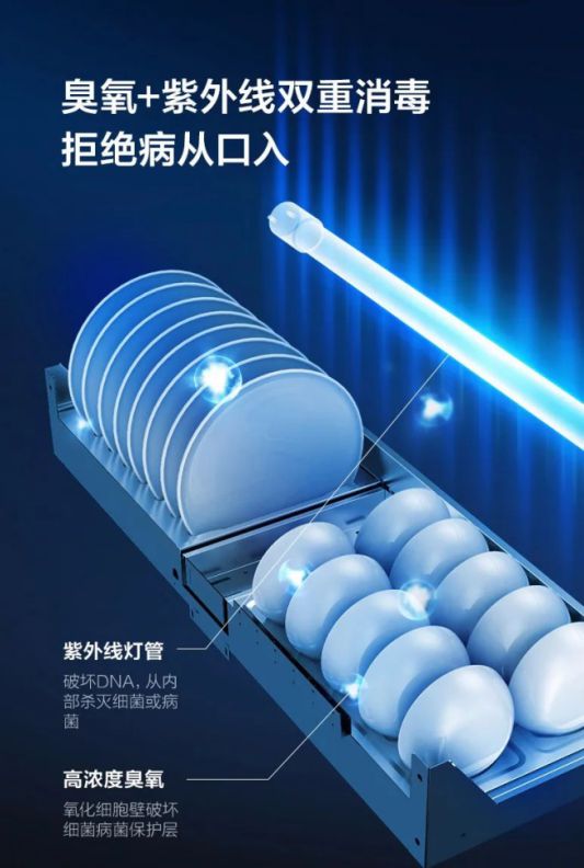 柯菱集成灶設計了消毒柜紫外線+臭氧雙重消毒功能,大腸桿菌、脊髓灰質炎病毒等病菌,給你無菌體驗!