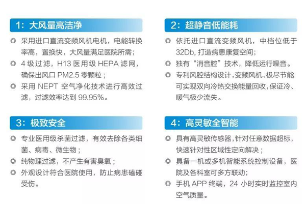 由此可見,霍爾新風產品在空氣潔凈度級別、送風方式、低噪音范圍等方面達到了高標準的醫院空氣凈化設備的設計要求,更能減少醫院空調系統的能耗高效節能,產品一經上市,就廣受用戶稱贊,更是不斷入駐各省市級醫院。