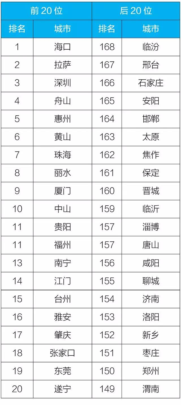 2019年1月至6月,168個重點城市中的前20名和后20名