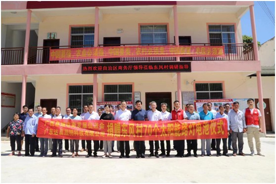 在自治區(qū)商務(wù)廳的牽線下,廣西縣域電商發(fā)展促進(jìn)會和廣東達(dá)晨照明科技有限公司為東風(fēng)村捐贈了70盞太陽能路燈。此次捐贈的路燈將極大地改善東風(fēng)村村民的夜晚出行條件,提高了夜間出行的安全指數(shù),也為東風(fēng)村推進(jìn)鄉(xiāng)村振興戰(zhàn)略、提升鄉(xiāng)村治理形象帶來了新的發(fā)展曙光。