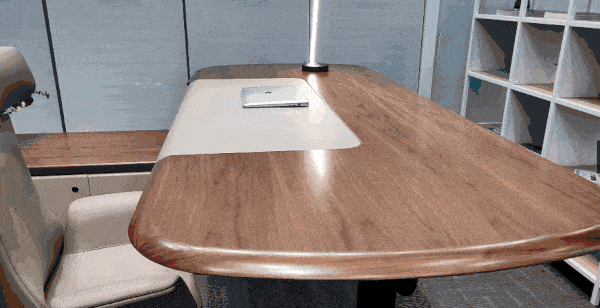 李寧介紹說:“‘橋系列’的設計來源,是海太歐林的研發總監在一次差旅中看到的一座橋墩,在此基礎上,我們研發了一張5.4米長的大型會議桌,它是具有升降功能的?!?/p>