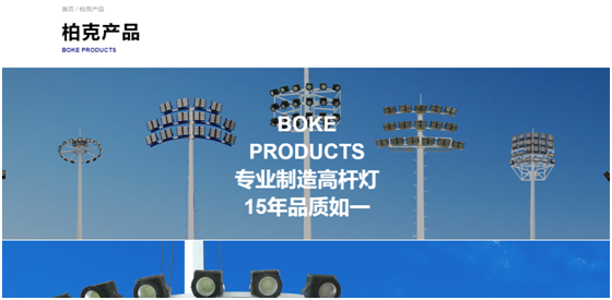 產品是企業生存的根本。多年來,柏克體育匠心制造,不斷向市場輸送高桿燈、常規燈桿、燈具、配件等多元化產品,為彌補市場空白貢獻出重要力量。作為成熟系統的品牌官網,對產品的展示自然不可或缺。