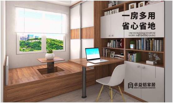 像卓益鋁家居將“榻榻米床+衣柜+書架”結合在一起的設計方式,既能提供大量的儲物空間,又能創造個性與休閑的家居氛圍,美觀實用兩不誤!