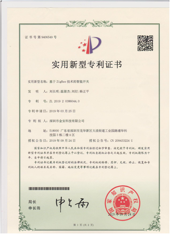 喜訊頻傳,又奏佳音,在簡舒智能家居研發團隊的不斷努力突破下,2019年再次喜獲由中華人民共和國國家知識產權局授予的多項技術專利證書,其中包括四項實用新型專利證書和一項計算機軟件著作權登記證書,四項實用新型證書分別是: