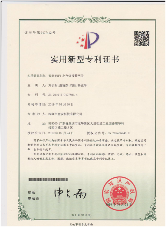 智能WiFi小夜燈報警網關(專利號: 第9407412)