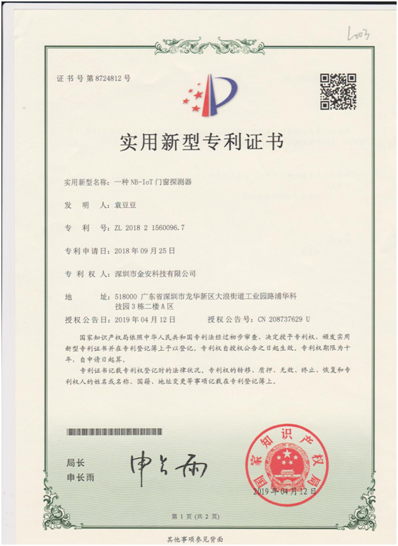 一種NB-IOT門窗探測器(專利號:第8724812號)