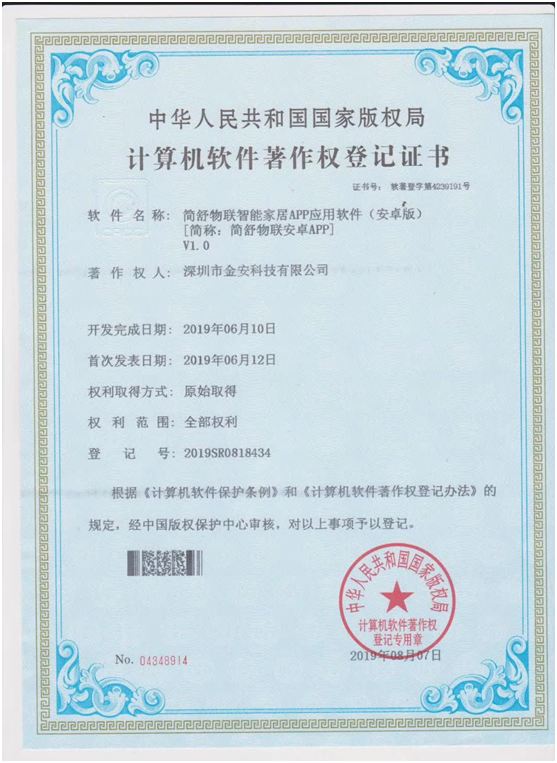 實用新型專利證書和軟件著作權證書是由國家相關的權威機構經過一系列硬性指標和復雜的流程,經評審后才會頒發,只有一家研發實力強悍的企業才能獲此殊榮,簡舒智能家居從榮獲國家高新技術企業開始,就表明了其在企業管理、科技創新、生產能力、未來潛力等多方面都比較優越,同時這也是簡舒智能家居具有強大市場競爭力的佐證,代表著國家部委對簡舒智能家居研發成果、科學技術創新成果的高度肯定。