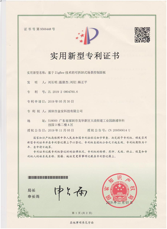 2、基于ZigBee技術(shù)的可拆卸式場景控制面板(專利證書號:第9566448號)