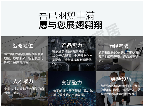 創(chuàng)新不輟就要百折不撓,追求卓越之路布滿艱辛,創(chuàng)新之路更是充滿風險,簡舒智能家居作為全屋智能家居行業(yè)的領(lǐng)導者,以高瞻遠矚的發(fā)展高見,大膽投入巨資組建國際性科技研發(fā)團隊,在創(chuàng)新的道路上一次次跌倒,又一次次站起,在學中干,干中學,掌握新知識、鍛造新技能、增長新本領(lǐng),最終以國際先進技術(shù)為標準,自主研發(fā)生產(chǎn)全系列智能家居產(chǎn)品,涵蓋智能家居控制系統(tǒng)、智能門鎖系統(tǒng)、智能單品、智慧酒店管理系統(tǒng)、智慧辦公五大系統(tǒng),支持LORA、NB-IOT、ZigBee、wifi等多種無線協(xié)議,提供智慧家庭、智慧酒店、私人影院、智慧辦公等一站式解決方案,共擁有50多項技術(shù)專利和30多項外觀專利,以及多個軟件著作權(quán),取得了令人贊嘆的豐碩成果。