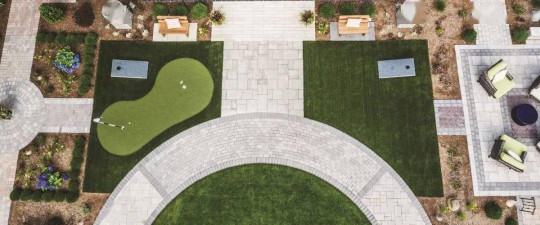 整個(gè)花園空間就像一個(gè)巨大的廣場(chǎng),周圍環(huán)繞著一個(gè)中心圓的草坪,旁邊是單獨(dú)分割的座位區(qū),草坪上有一個(gè)高爾夫Green果嶺區(qū)和一個(gè)玉米洞Cornhole游戲區(qū)。這塊區(qū)域設(shè)計(jì)的原因考慮到當(dāng)?shù)氐奶鞖猓觳粫?huì)太冷,不會(huì)有凍土或者大雪,客戶可以一年四季在娛樂區(qū)玩耍。