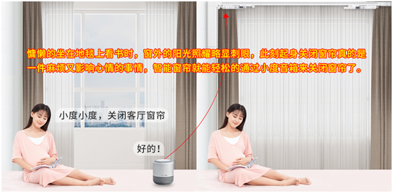 周未慵懶的躺在沙發上玩手游、看小說時,窗外的陽光照耀略顯刺眼,此刻起身關閉窗簾真的是一件麻煩又影響心情的事情,但是你安裝一個智能窗簾能就輕松的通過小度來關閉窗簾了,一句話搞定開關窗簾是一件很容易的事情“小度小度,關閉客廳窗簾”,窗簾立即乖乖的關閉,是不是瞬間讓我們的家居生活方便又貼心了很多呢?