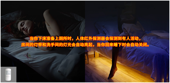 每天晚上起床上廁所,摸黑開燈,特別是家中有老人或者小孩的,特別容易磕磕碰碰或者摔傷,但是你使用簡舒智能開關和人體紅外探測器就能夠輕松實現起夜燈光自動亮起,當你下床準備上廁所時,人體紅外探測器會探測到有人活動,房間的燈帶和洗手間的燈光會立即自動亮起,當上完廁所回來睡下時,燈光又會自動關閉,是不是覺得這樣的生活特別方便?
