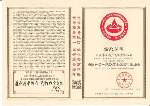 2019年3月15日,廣東偉業(yè)鋁廠(chǎng)集團(tuán)再次榮獲“全國(guó)產(chǎn)品和服務(wù)質(zhì)量誠(chéng)信示范企業(yè)”稱(chēng)號(hào)。鋁合金著名品牌偉業(yè)連續(xù)四年被授予這一特殊榮譽(yù),也見(jiàn)證了其創(chuàng)造高品質(zhì)產(chǎn)品并奉獻(xiàn)給社會(huì)的責(zé)任和承諾。