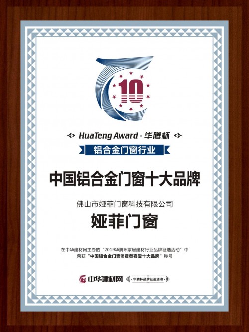 婭菲門窗自成立以來,取得了巨大的成就和卓越的業(yè)績,用自己的努力征服了許多消費者和經(jīng)銷商。現(xiàn)在婭菲門窗不僅是消費者的最愛,也是加盟商的瑰寶。此次,婭菲門窗在由“中華建材網(wǎng)”打造的中國家居建材行業(yè)首屆“華騰杯”品牌評選活動中獲得了“2019中國鋁合金門窗消費者喜愛十大品牌”。